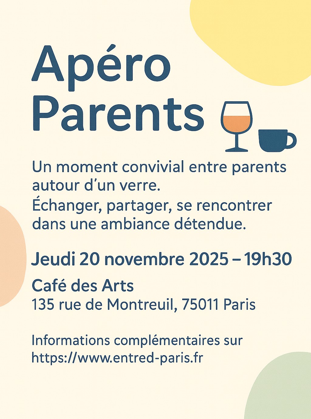 Chaque 3ème jeudi du mois, envie de partager vos expériences, des questions que vous n’oseriez pas aborder, discuter du DT1 sans vos enfants… ou simplement envie de boire un verre ! Vous êtes bienvenus à l’apéro des parents!